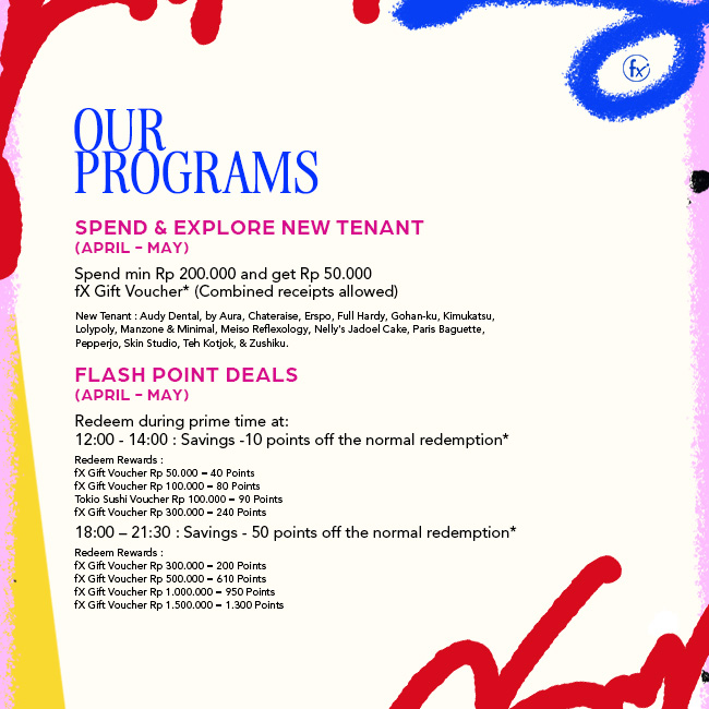 Temukan berbagai promo di setiap bulannya, dan tukarkan segera di fX Sudirman.